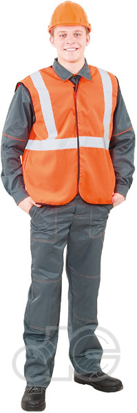 Жилет с центральной застежкой на «велкро». Отделка светоотражающими полосами необходима для обеспечения безопасности работ в условиях плохой освещенности и в темное время суток.