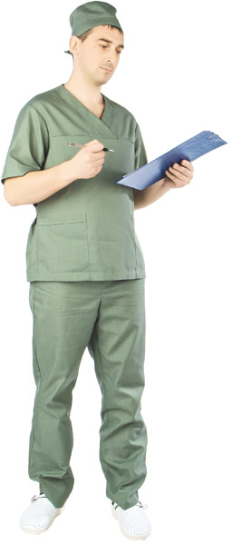 Блуза с V-образным вырезом горловины, короткими рукавами, нагрудными внутренними и нижними накладными карманами. горловина, рукава, нижние карманы оформлены верхними отделочными планками. В боковых швах, вставлены хлястики для обеспечения облегания по фигуре.