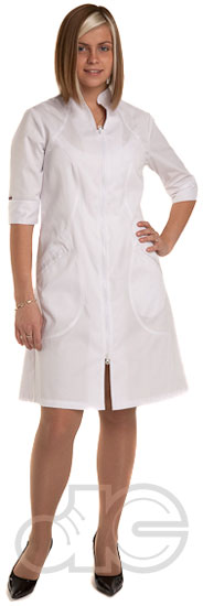 Халат с воротником - стойкой и центральной застёжкой на молнию, полуприлегающего силуэта. Полочки с кокетками и двойными фигурными подрезами. Спинка с рельефами. На нижних частях полочек прорезные карманы "в рамку".